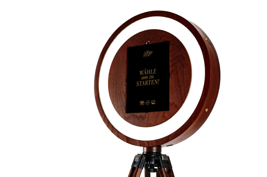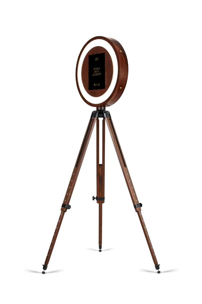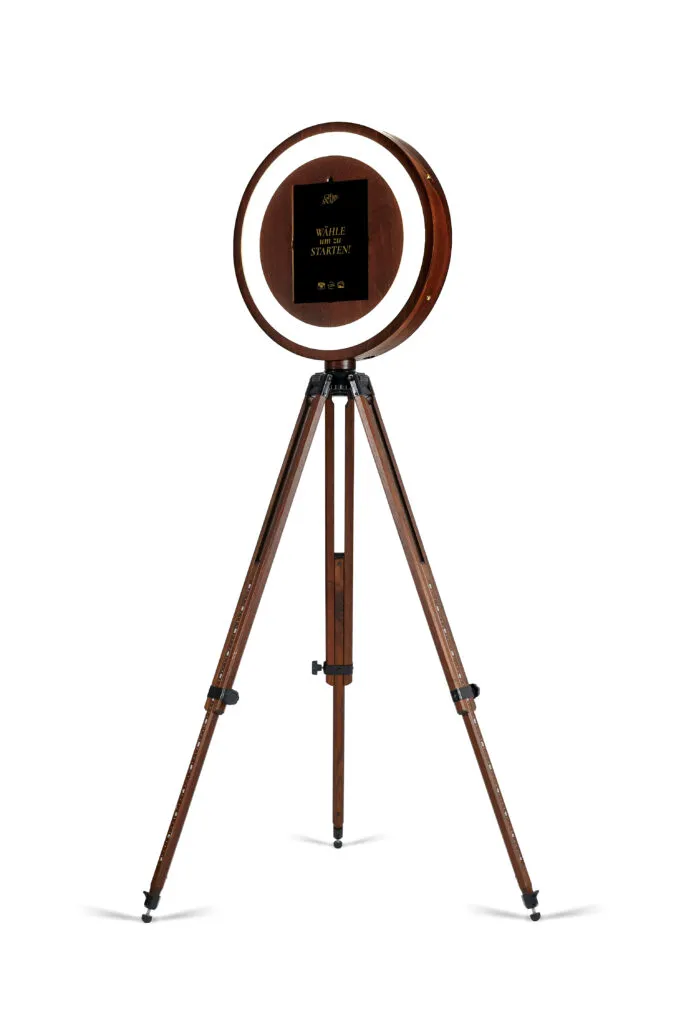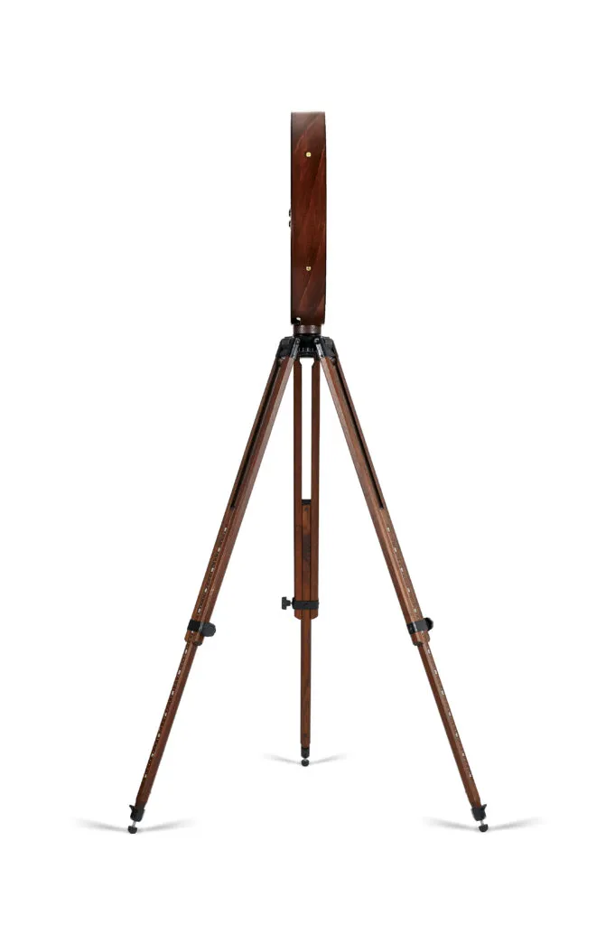 - Mechanik im Bild: Die massive Schraubverbindung zwischen Korpus und Stativ wurde als funktionales Detail inszeniert, um die Portabilität und Stabilität visuell zu belegen.