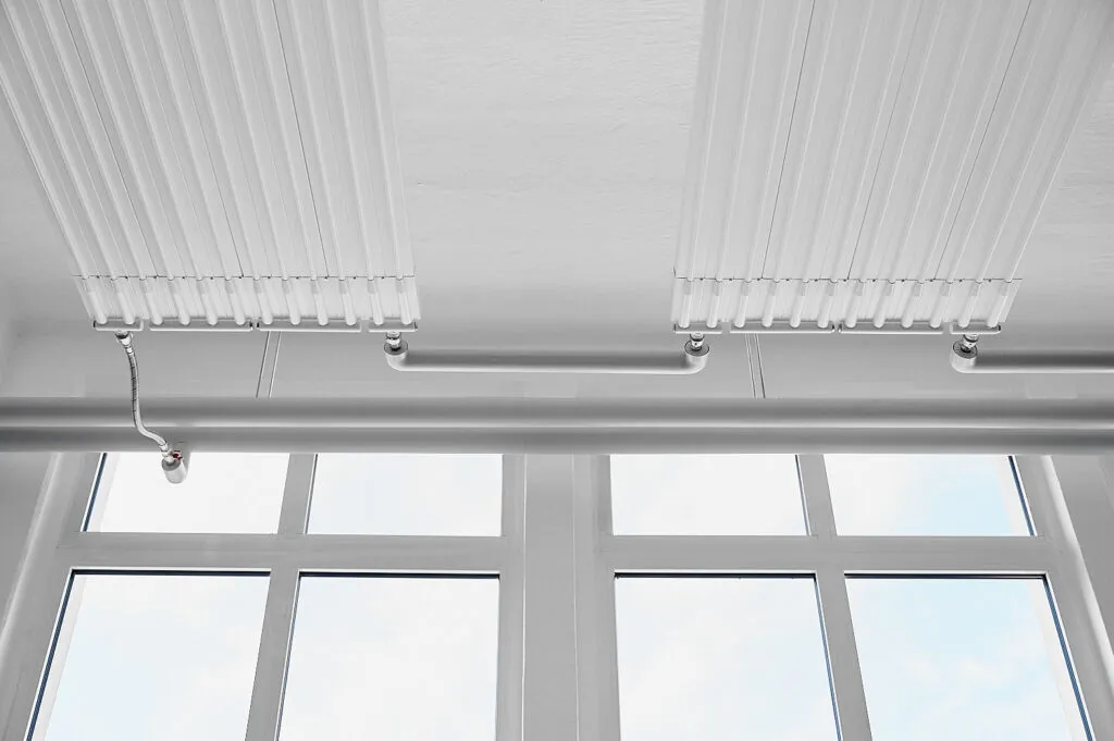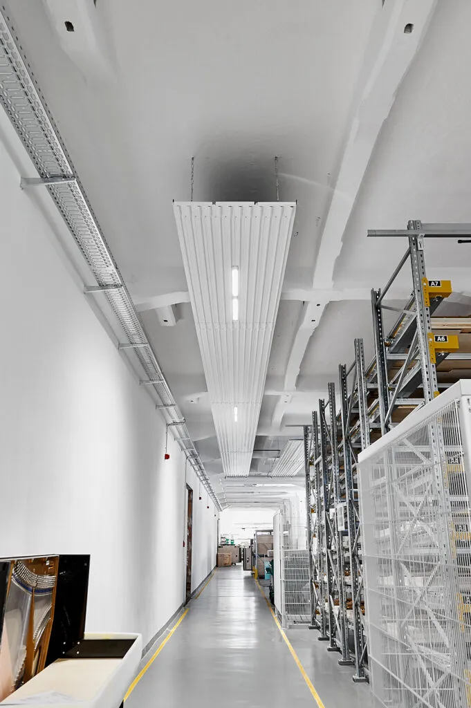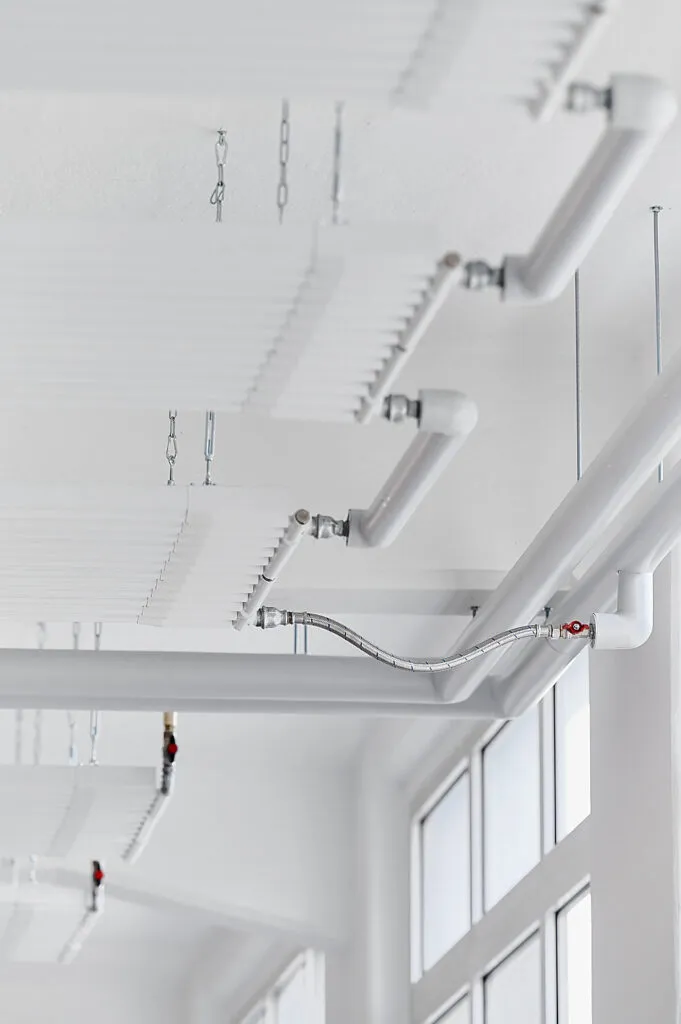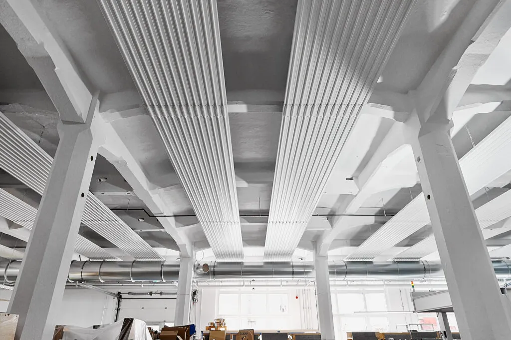 So entsteht ein nüchterner, technischer Look, der die Funktionalität der Deckenheizung in den Mittelpunkt stellt.
