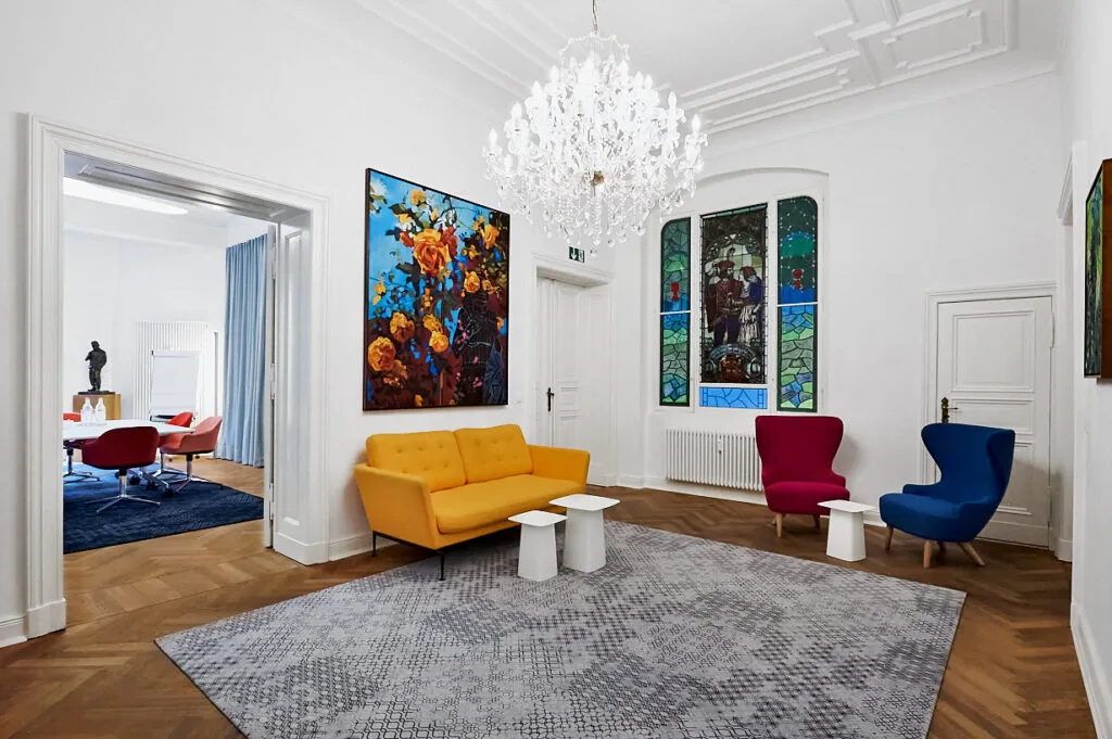 Wichtig war die präzise Steuerung des vorhandenen Tageslichts, unterstützt durch punktuelle Ausleuchtung, um Texturen wie Stoffe, Holzoberflächen und akustisch wirksame Elemente klar herauszustellen. Die kräftigen Farbflächen und der markante Kristalllüster im Empfang verlangten nach einer ruhigen, ausgewogenen Perspektivwahl, damit keine Überstrahlung oder unnatürliche Farbstiche entstehen.